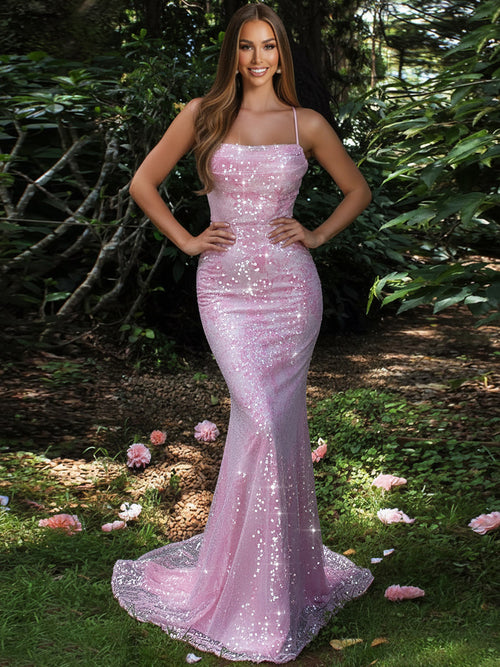 Sheath/Column Sparkly Sequin Spaghetti Strap Square Neck Floor-Length Prom Dresses with Slit