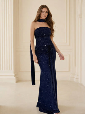 Strapless Scarf Sequin Ruched Prom Dresses Evening Mermaid Bodycon Sparkly