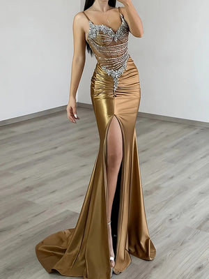 Mermaid Sweetheart Floor Length Sequined Evening Dresses with High Split