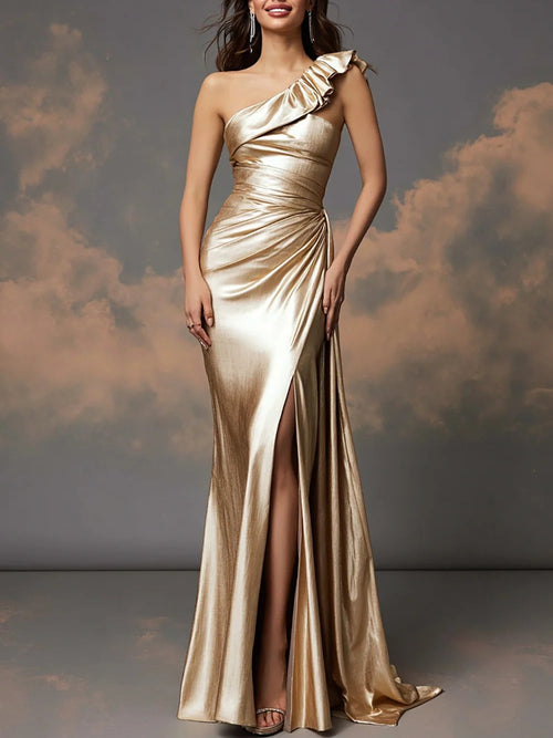 Ruffle One Shoulder Ruched Metallic Long Prom Dresses Sheath/Column Ball Gowns with Train