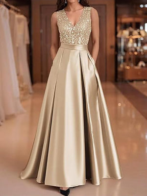 A-Line/Princess V-Neck Pleated Satin Floor-Length Mother of the Bride Dresses with Sequins