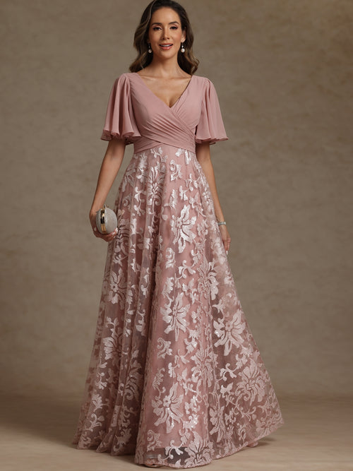 A-Line/Princess V-Neck Ruched Sequin Floor-Length Formal Evening Dresses with Half Sleeve
