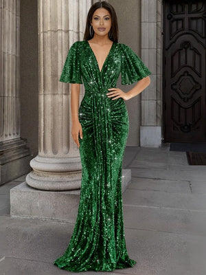 Mermaid/Trumpet V Neck Flutter Sleeve Floor-Length Formal Evening Dresses with Sparkly Sequin