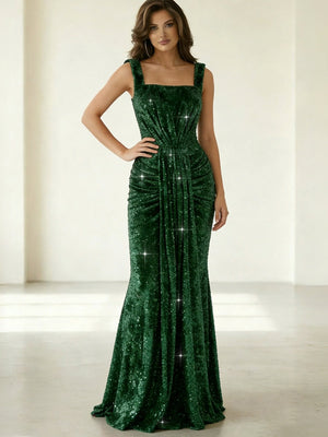 Mermaid/Trumpet Square Neck Ruched Floor-Length Formal Evening Dresses with Sparkly Sequin
