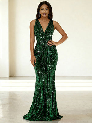 Mermaid/Trumpet V-Neck Ruched Floor-Length Formal Evening Dresses with Sparkly Sequin