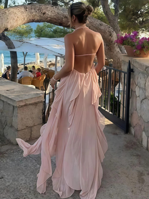 A-Line/Princess Tiered Halter Floor-Length Wedding Guest Dresses