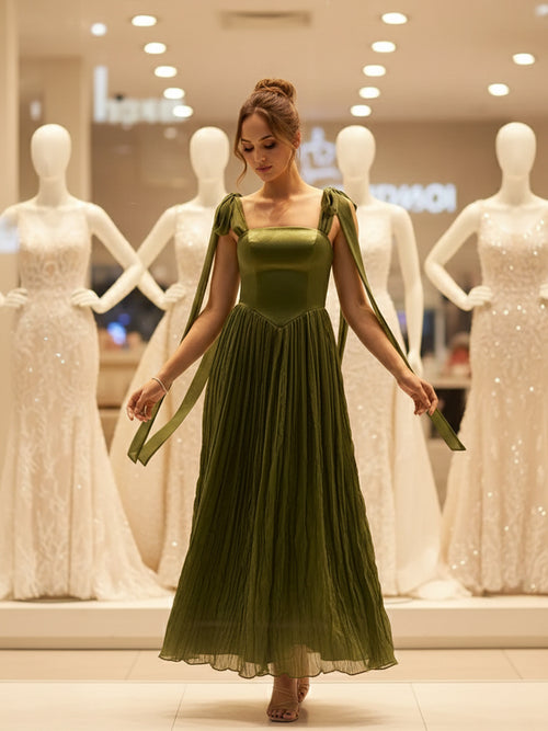 A-Line/Princess V-Neck Spaghetti Strap Floor-Length Formal Wedding Guest Dresses with Pleated Satin