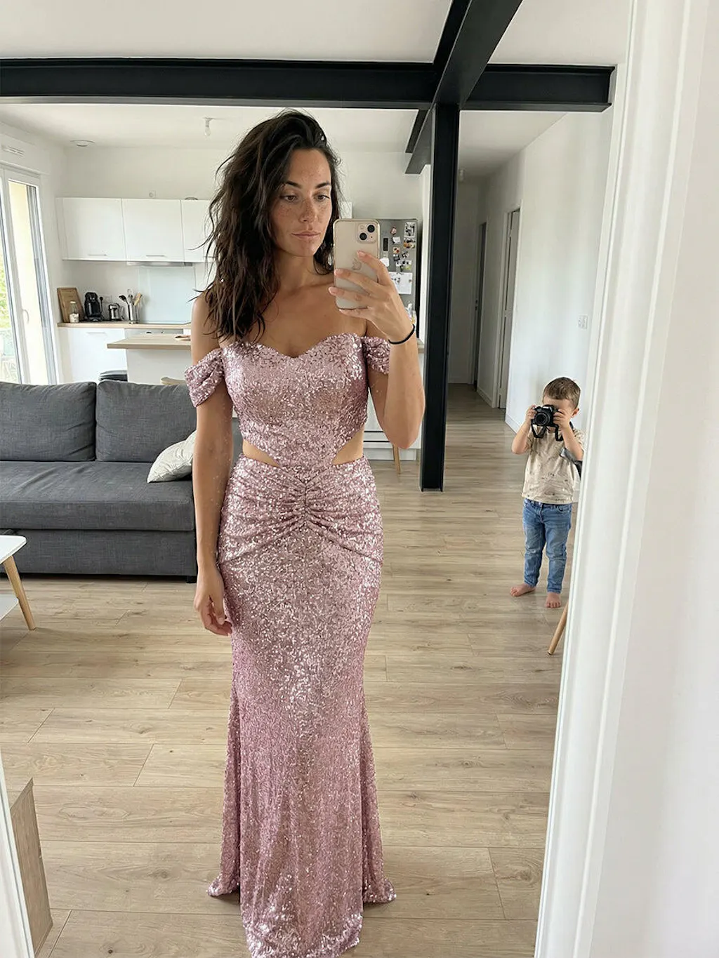Sequin Mermaid Off Shoulder Sweetheart Maxi Prom Gown with Ruched Waist (SHI22342887)