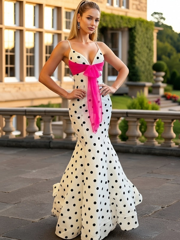 Mermaid V Neck Polka Dot Sleeveless Floor Length Prom Gown with Bow