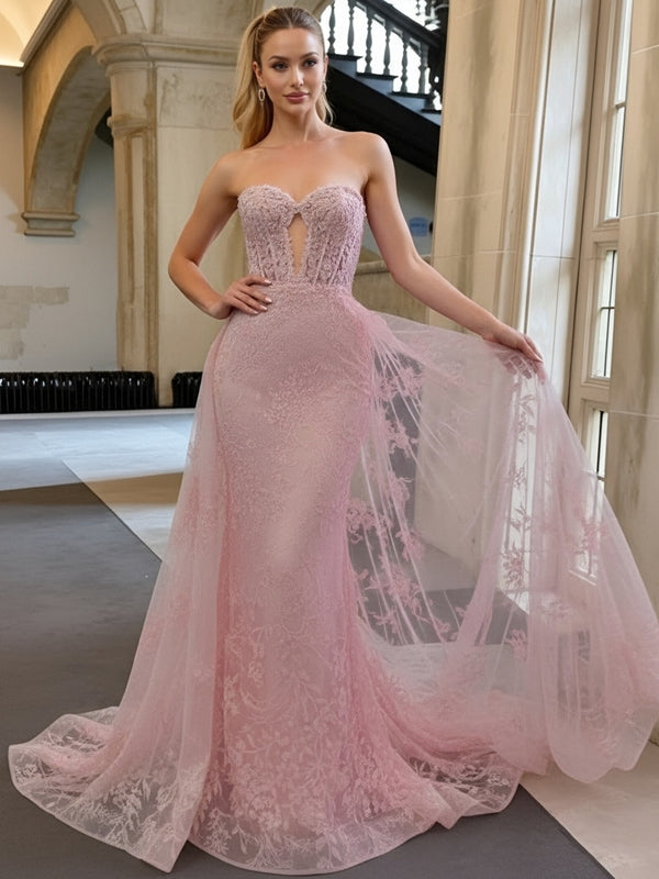 Mermaid Strapless Sweetheart Neck Floor Length Prom Dresses with Lace Appliques