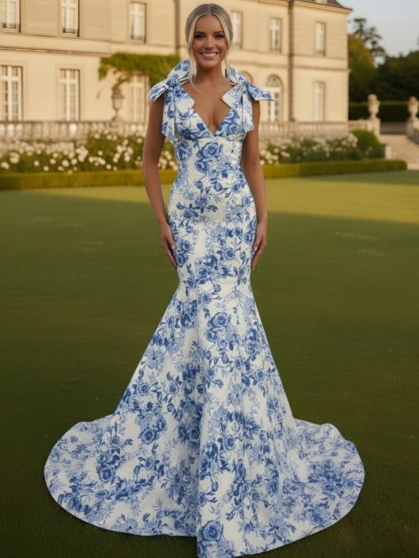 Mermaid/Trumpet Strapless Print Flower Floor Length Prom Dresses with Bows