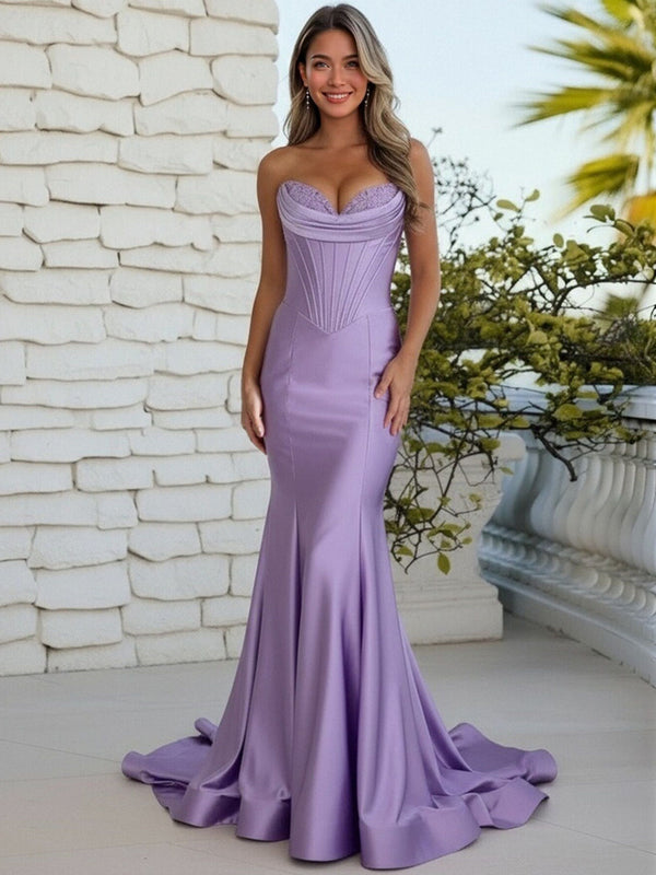Strapless Satin Floor-Length Corset Prom Dresses Ruched Mermaid High Slit