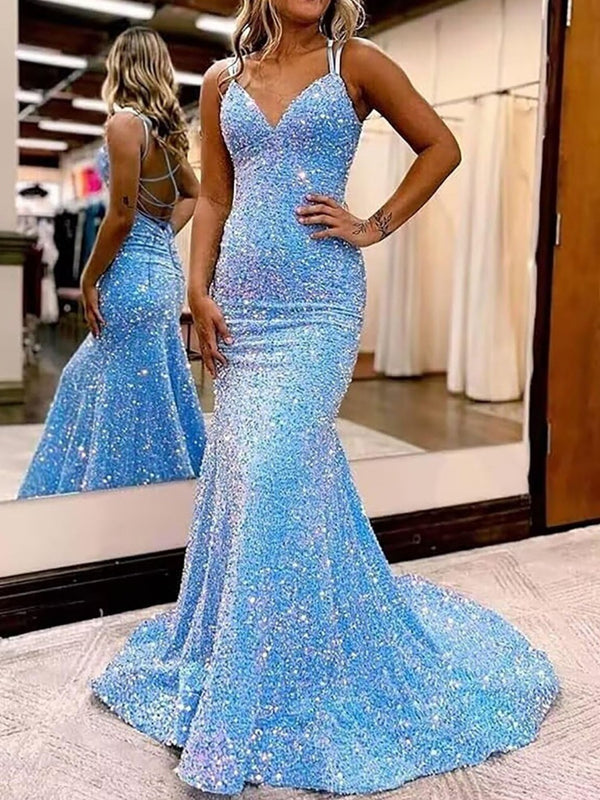 Mermaid/Trumpet Spaghetti Strap V Neck Floor-Length Prom Dresses with Sequin