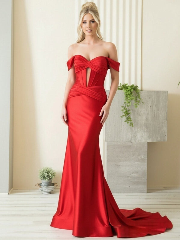 Mermaid/Trumpet Off Shoulder Sweetheart Satin Cut-Out Floor-Length Prom Dresses