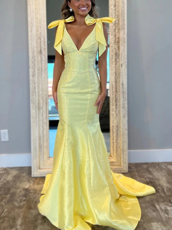 Sparkly V-Neck Bow Strap Beading Long Prom Dresses Mermaid with Train