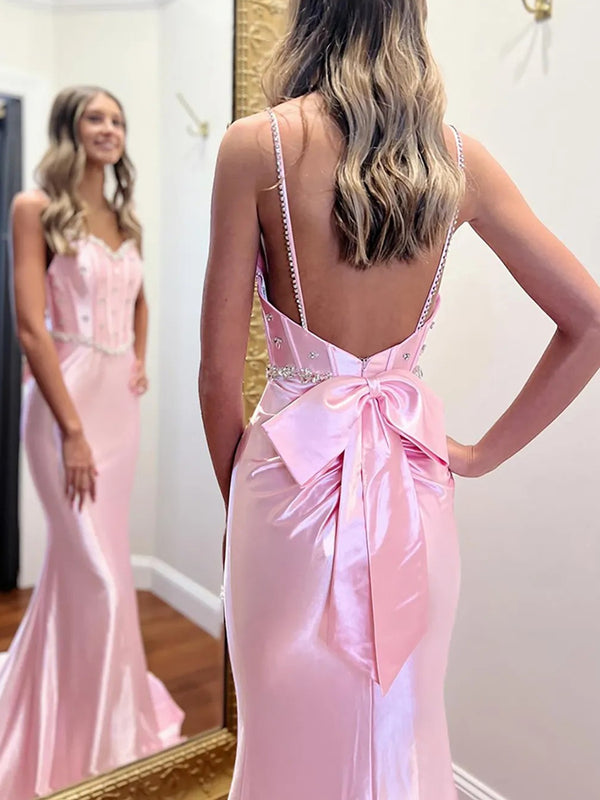 Spaghetti Strap V-Neck Bow Back Mermaid Long Prom Dresses with Sparkly Appliques