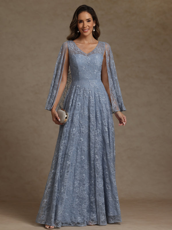 A-Line/Princess V-Neck Illusion Lace Appliques Sequins Floor-Length Mother of the Bride Dresses with Cape