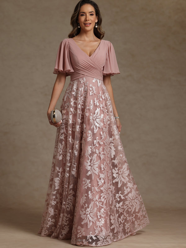 A-Line/Princess V-Neck Pleated Floor-Length Mother of the Bride Dresses with Sequins
