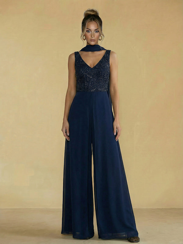 Jumpsuit V Neck Sparkly Sequined Mother of the Bride Dresses with Scarf