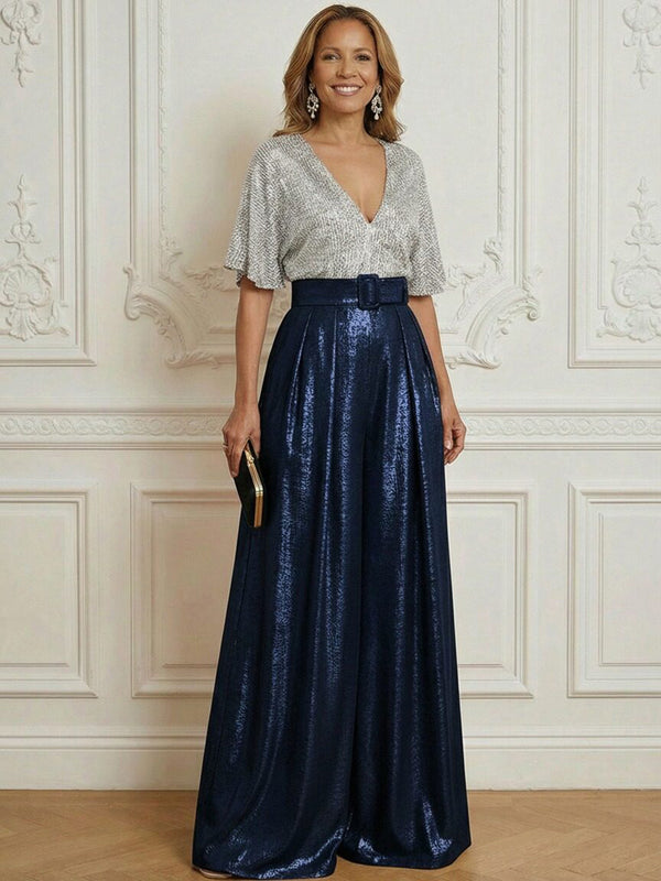 Jumpsuit V Neck Half Sleeve Long Sparkling Mother of the Bride Dresses with Belt