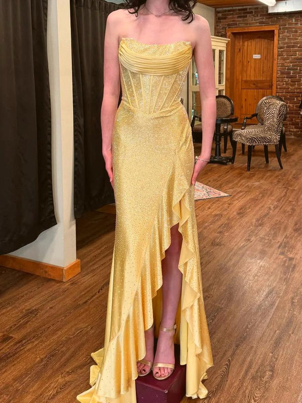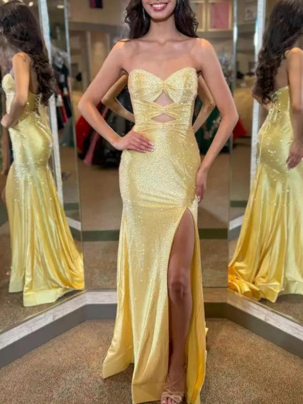 Sheath/Column Glitter Drop Waist Floor Length Prom Dresses with Slit