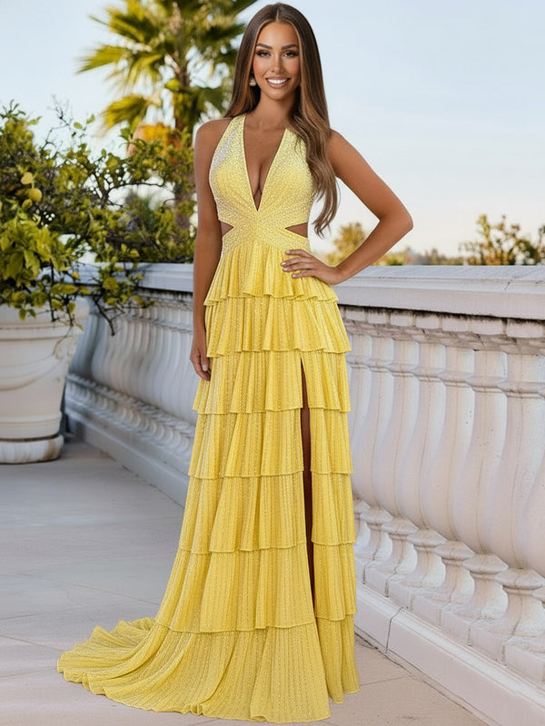 A Line/Princess Halter Tiered Cut-Out Floor-Length Fancy Prom Dresses with Beads