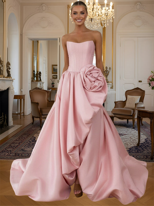 Bubble Drop Waist Strapless Floor Length Prom Dresses with Flower