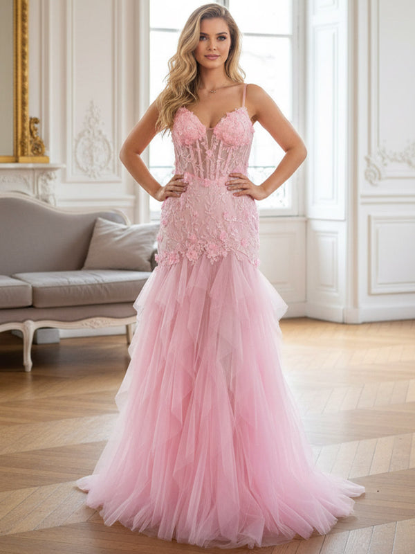Mermaid Drop Waist Ruffle Tiered Spaghetti Strap Floor Length Prom Dresses with Applique