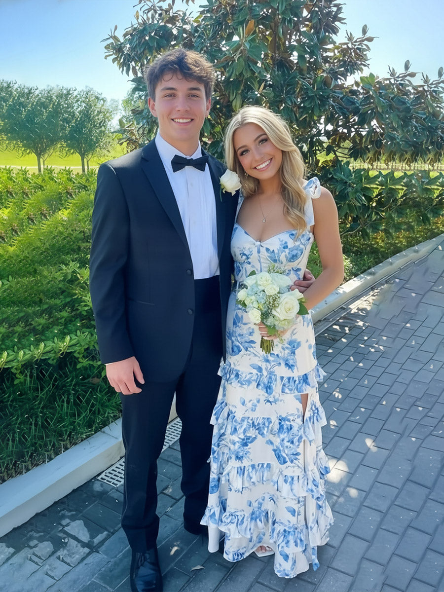 Ruffle A Line/Princess Floral Bow Straps Tiered Prom Dresses with Belt